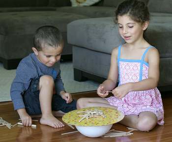 Untuk game ini Anda akan membuat platform untuk membangun dan menumpuk yang melekat pada setengah bola sehingga bergetar. Anak-anak akan menumpuk batang es loli di atas sambil mencoba menjaga agar platform tetap seimbang sehingga tidak memberi tip dan menjatuhkan mereka semua (yang sebenarnya adalah bagian favorit Theo)!